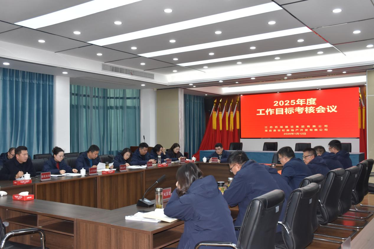 2026年1月12日,集团考核工作组在组长戴治年的带领下,抵达江苏百域建设集团有限公司及宝应县世纪房地产开发有限公司,开展2025年度工作目标考核考评工作。百域公司中层以上管理人员参加会议,配合完成考核相关流程。