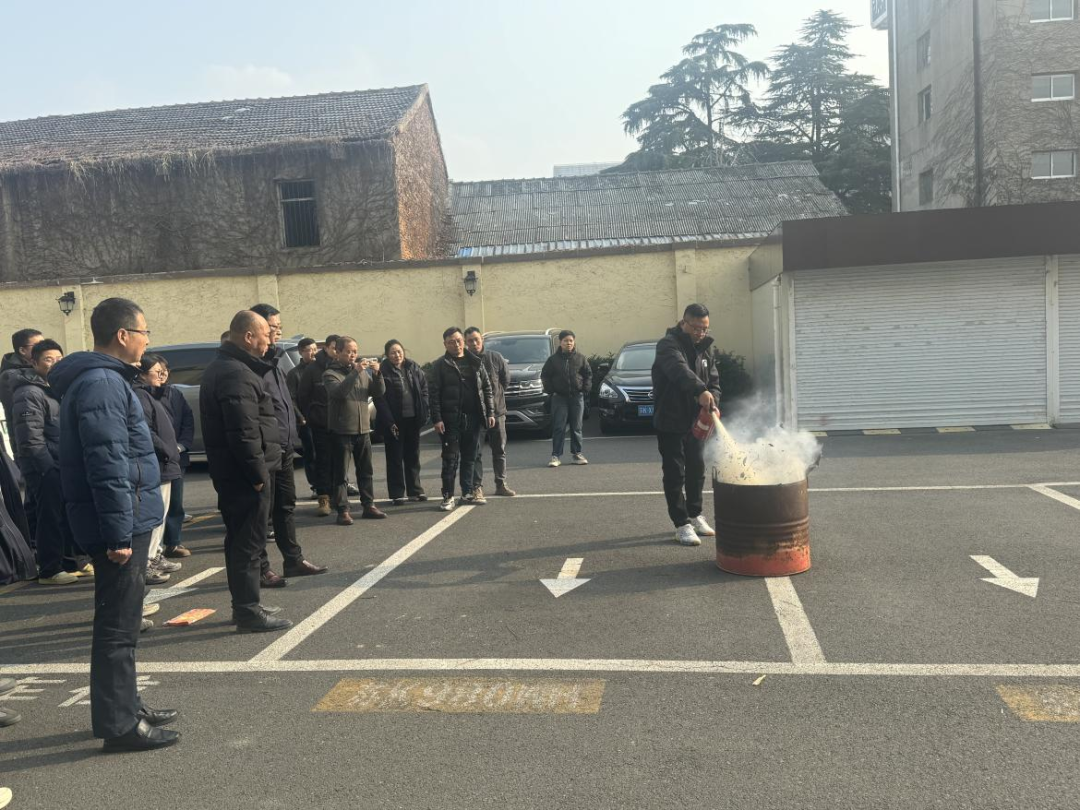 模拟公司停车场区域突发火情。发现火情后,现场人员立即上报并启动消防应急预案。疏散引导组迅速组织周边人员用湿毛巾捂住口鼻,弯腰低姿有序撤离至安全地带;灭火行动组快速携带灭火器材赶赴现场,熟练使用灭火器对模拟火点进行扑救,有效控制了火势蔓延。